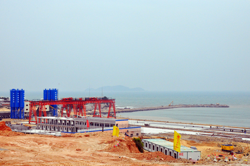 東防波堤工程全長5423米,西防波堤工程全長3315米,口門寬度600米。口門堤頭段采用直立式沉箱結(jié)構(gòu),其他堤身段采用拋石斜坡堤結(jié)構(gòu),共需拋填各類石料1060萬m3,澆筑混凝土82.6萬 m3,項目總投資為25.45億元,建安費17.94億元。東西防波堤建成后,形成港池面積6平方公里,岸線10850米,可建3-30萬噸級泊位30-35個,設(shè)計吞吐量2億噸。