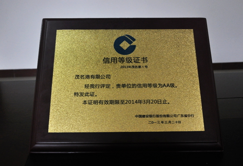 ![]() 3月20日,茂名港集團(tuán)榮獲中國(guó)建設(shè)銀行股份有限公司廣東省分行頒發(fā)的“AA級(jí)”企業(yè)信用等級(jí)證書。